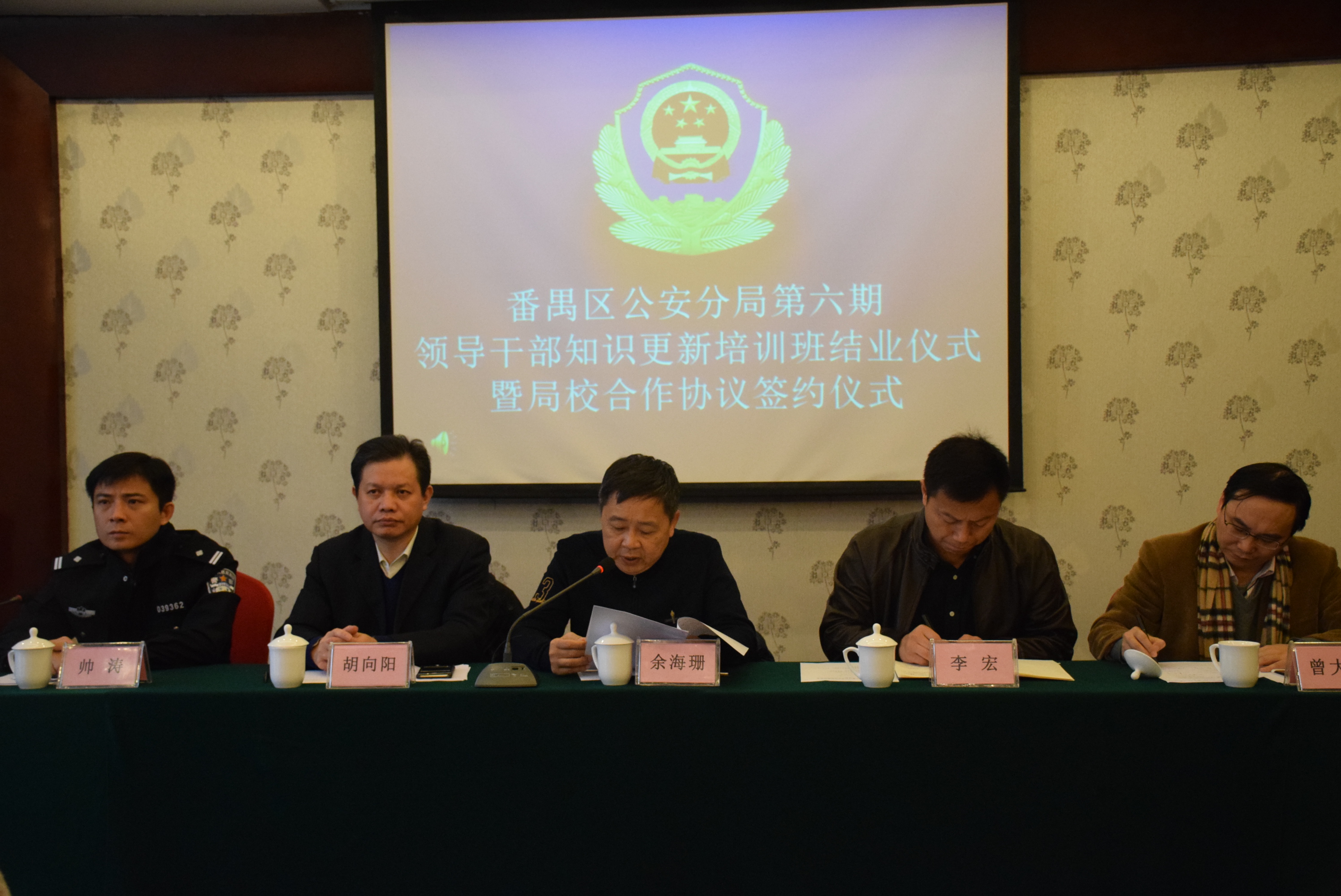 (通讯员 苏乐弦 张盛晗 马悦鑫 卢建勋)2015年11月24日上午九时许,于中天世纪大酒店明昭厅举行我院与广州市公安局番禺区分局局校合作协议签约仪式暨第六期领导干部第六期培训班结业典礼。我院党委书记李宏教授,院长胡向阳教授,番禺区公安分局党委副书记、政委余海珊,我院培训中心主任曾大庆老师,番禺区公安分局政工办副主任帅涛出席本次仪式。