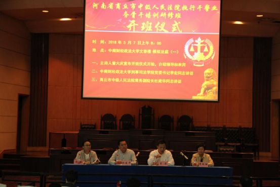 (通讯员:魏泽宇)2018年5月7日上午,河南省商丘市中级人民法院执行干警业务骨干培训班开班仪式在模拟法庭一举行。商丘市中级人民法院常务副院长杜建华同志,执行局局长曹秋丽同志,我院党委书记李宏同志,商丘市中级人民法院以及商丘地区9个基层法院的103名学员出席了本次开班仪式,本次仪式由我院培训中心主任曾大庆主持。