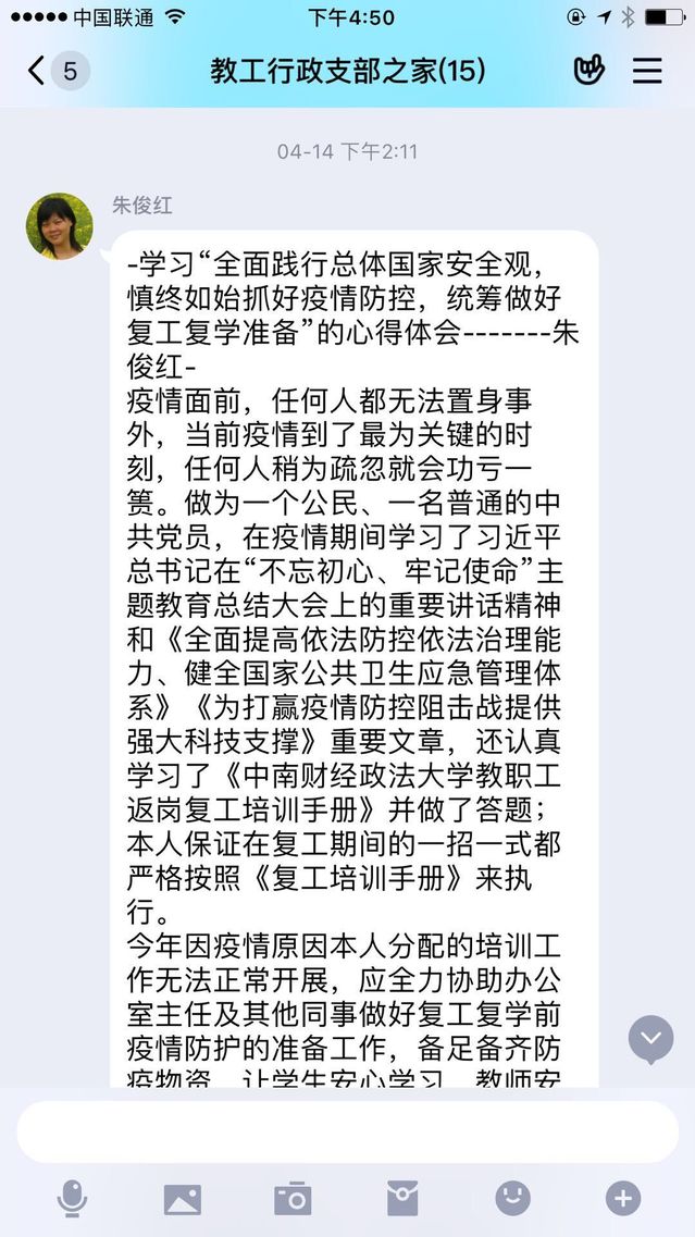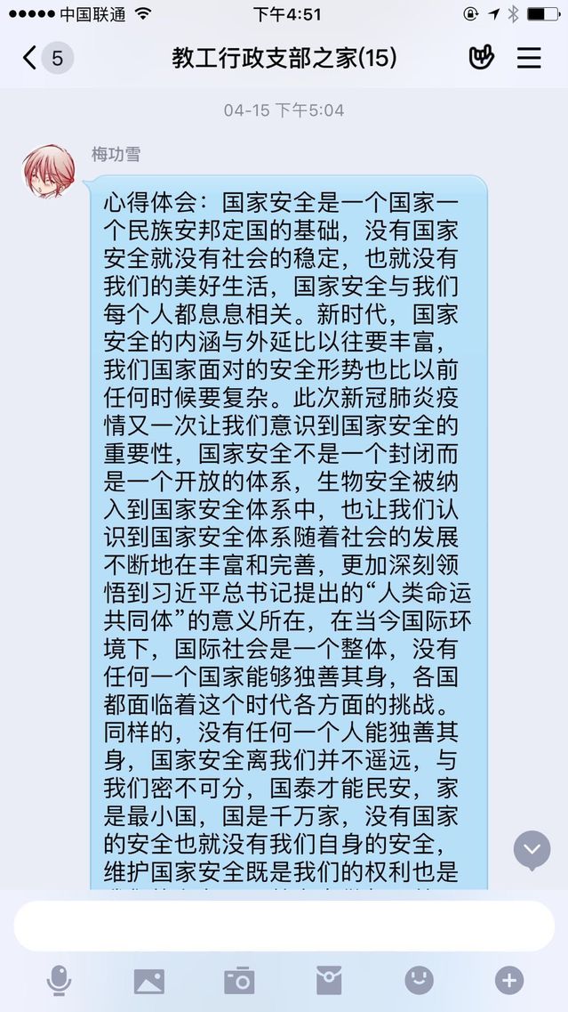 新闻网讯(通讯员王晓丹)为贯彻落实学校“全民国家安全教育日宣传教育”的工作要求,按照学校疫情防控和复工复学总体工作安排,2020年4月14日起,学院行政教工党支部通过在线开展以“全面践行总体国家安全观,慎终如始抓好疫情防控,统筹做好复工复学准备”4月支部主题党日活动。