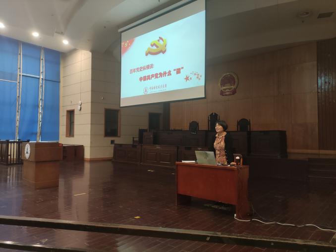 紧接着,宋州教授以《百年党史纵横谈:中国共产党为什么“能”》为题进行了授课,宋教授从历史和现实的交汇为切入点,阐述了从石库门到天安门,从兴业路到复兴路,中国共产党走过的百年峥嵘岁月。她提出,党史学习是同学们的基本线路之一,学党史、促品行、强身心。为何中国共产党能够从五十人的小政党发展为拥有着九千五百多万党员的世界第一大党,并且在七十年的执政历史中完成了三个“伟大飞跃”,带领着中华民族伟大复兴进入了不可逆的历史进程。宋教授以中外政党的对比,向我们展示了中国共产党坚定信念、绘制宏伟蓝图之时所创建的各种伟大成果。她指出,远大理想是激励中国共产党人前进的根本动力,为远大理想不懈奋斗是历史和人民选择共产党的最主要原因。宋教授提出希望在做的各位接班人能够接过历史的接力棒,为了祖国的繁荣昌盛贡献出一份力量。