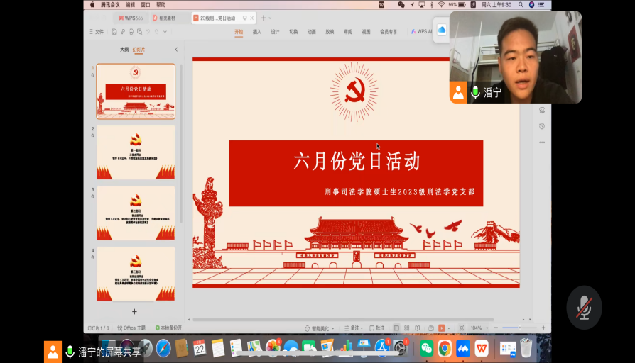6月22日上午,23级刑法学党支部在线上开展2024年6月份主题党日活动,本次活动主题是“严守党的“六大纪律”,当好遵规守纪模范”,支部全体党员及部分入党积极分子参与。