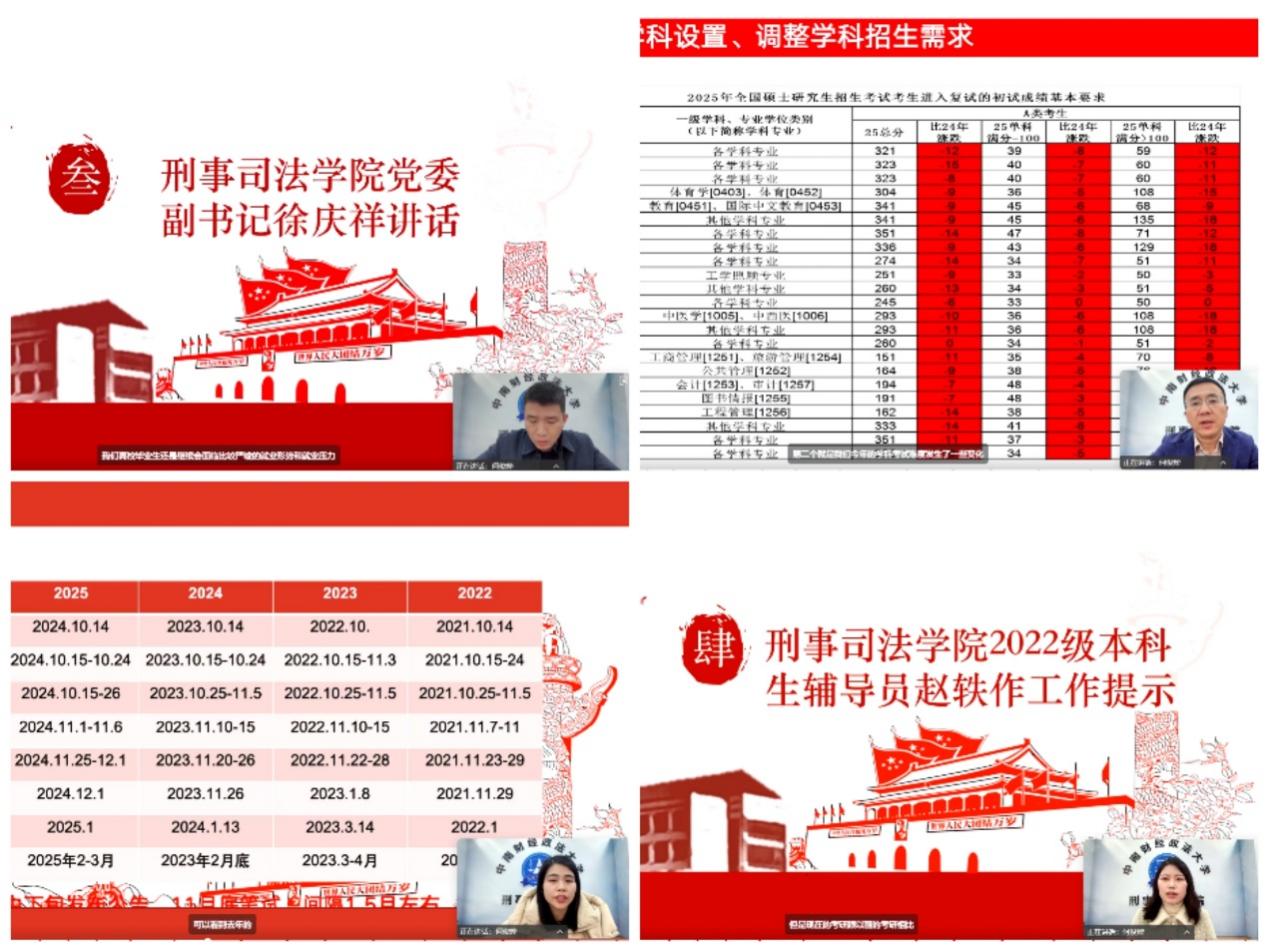 新闻网讯(学生通讯员 朱彬彬)为进一步增强家校沟通,形成家校共促共建合力,引导2026届毕业生做好职业规划,合理确定职业发展目标,实现更充分和更高质量就业,3月29日,刑事司法学院召开2022级就业工作云家长会。刑事司法学院党委副书记徐庆祥、2022级本科生辅导员赵轶及2022级全体学生家长参加会议。会议由赵轶主持,万学教育•海文考研教学与研究中心谭晓禹、华图教育陆婷受邀参会。