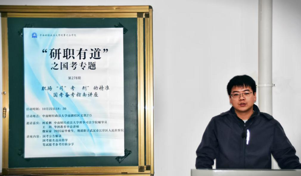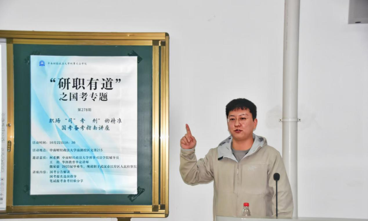 新闻网讯(学生通讯员 范晋霖 摄影 肖艺杰)为帮助我院研究生明晰公务员考试方向、掌握科学备考方法,缓解备考焦虑,10月22日晚,刑事司法学院于文澴楼215举办“研职有道”国考专题备考讲座。本次活动特邀刑事司法学院辅导员柯希鹏、2025届优秀毕业生魏家豪、华图教育申论讲师王玥,从公告解读、选岗策略到实战经验,为在场有公考意向的研究生构建起全方位备考指南。