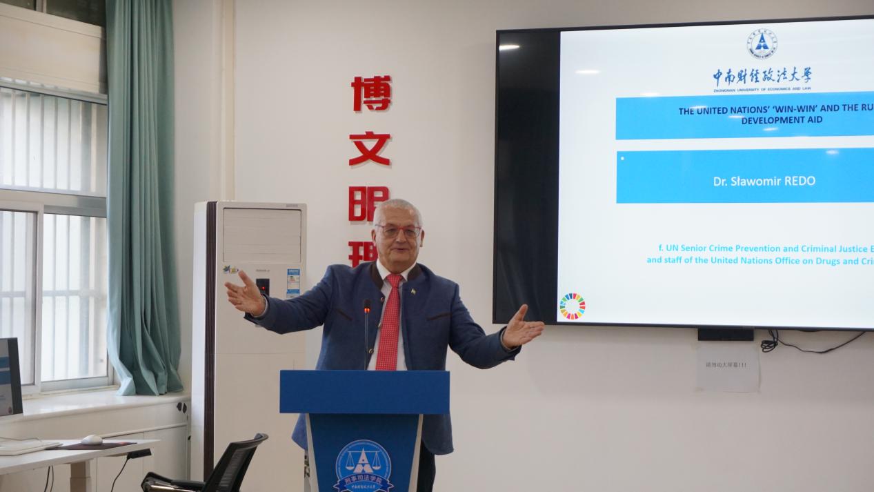 讲座特邀联合国法律客座教授斯拉沃米尔·雷多(Slawomir Redo)担任主讲嘉宾,围绕“联合国的发展援助中的‘双赢’与法治原则”展开。讲座由刑事司法学院副院长周凌教授主持,中南财经政法大学社会治理法学学科带头人徐汉明教授参加讲座。