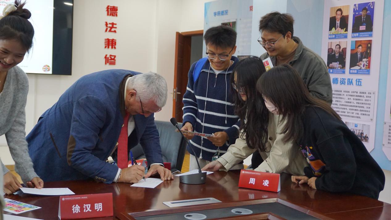 雷多教授在赠予同学们的明信片上签名并寄语