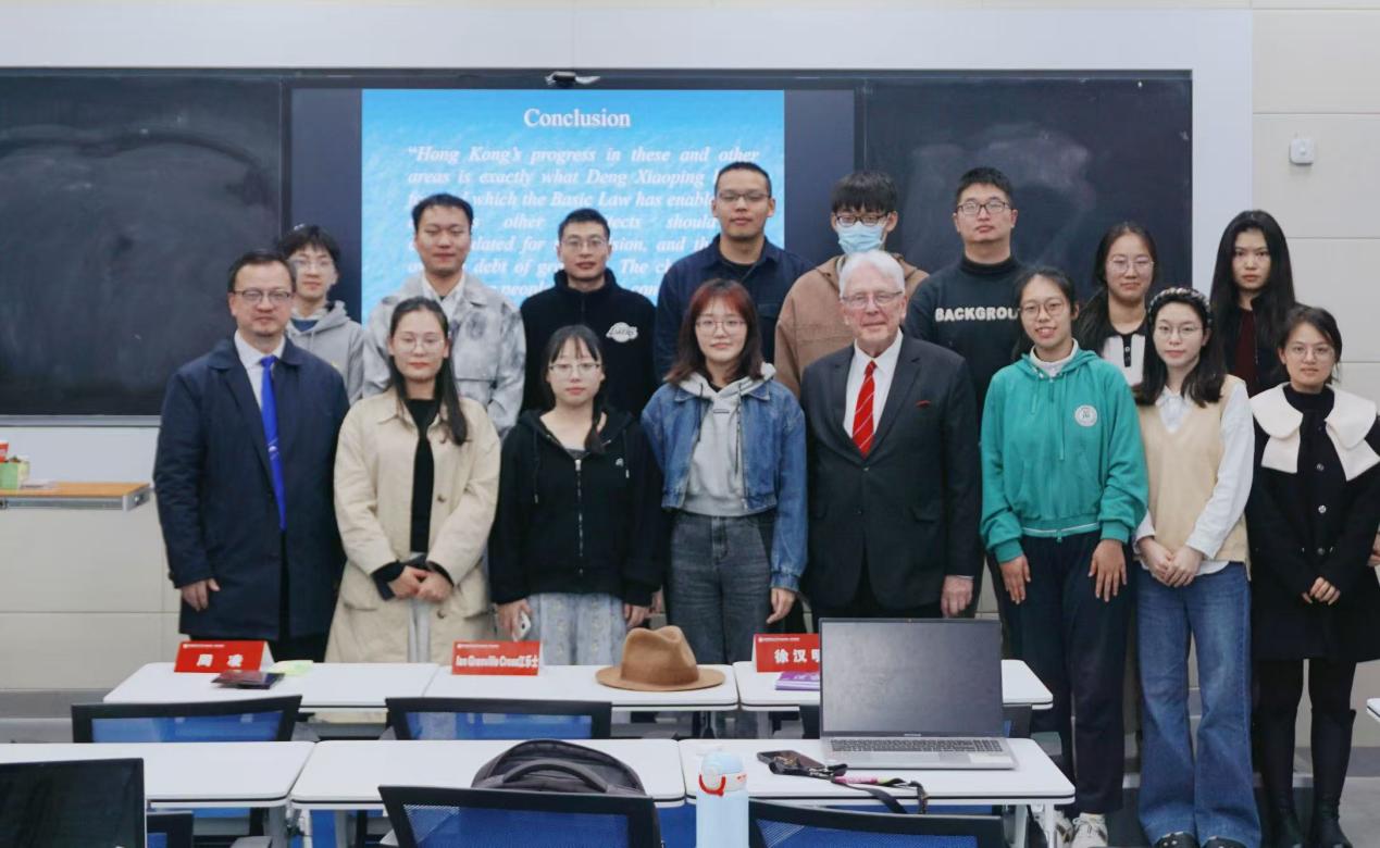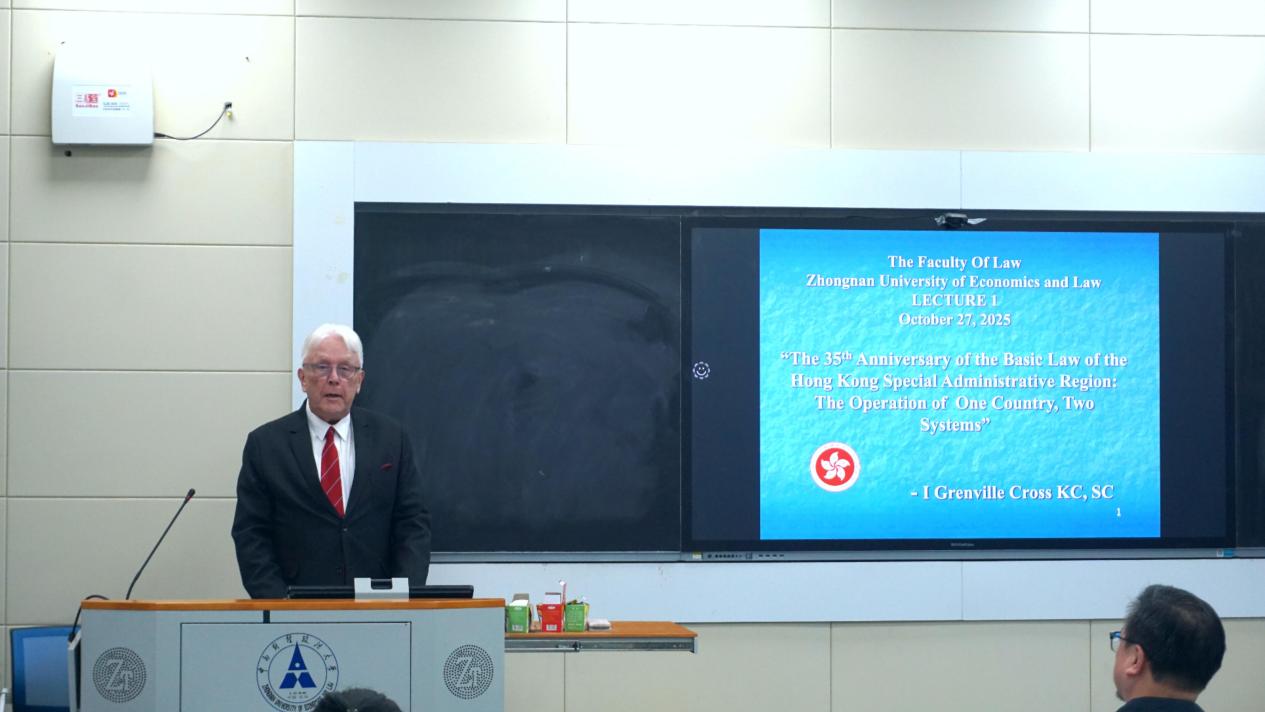 (学生通讯员 朱永康)1027日,由中南财经政法大学纪检监察学院(国家治理学院)、刑事司法学院、法学院及中南财经政法大学涉外法治人才协同培养创新基地主办,中南财经政法大学法治发展与司法改革研究中心、湖北法治发展战略研究院承办的“法治中国·大讲堂”第四十七讲,在中南财经政法大学文波楼成功举行。本次2025涉外法治创新课程第十四期特邀江乐士(lan Grenville Cross教授)担任主讲嘉宾,为纪检监察学院(国家治理学院)、刑事司法学院、法学院的博士和硕士研究生带来了一场以“《中华人民共和国香港特别行政区基本法》颁布35周年‘一国两制’的实践运行”为主题的讲座。讲座由刑事司法学院副院长周凌教授主持。