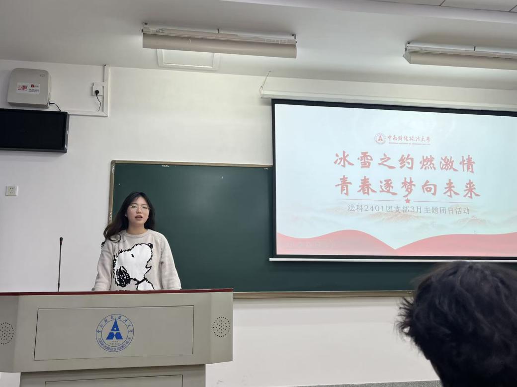 新闻网讯(学生通讯员 蒋承洋)为弘扬冬奥精神,汲取奋进力量,3月10日,法科2401班在文泰210教室开展“冰雪之约燃激情 青春逐梦向未来”主题团日活动。活动由团支书主持,通过视频观摩、榜样分享、互动交流等多种形式,带领全体团员感悟冬奥精神、砥砺青春担当。