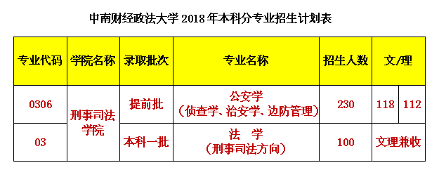 刑事司法学院招生分两个批次。根据教育部《提前录取专业招生办法》(教学司[2003]16号)文件,我校公安类专业(治安学、侦查学和边防管理)2018年面向北京、河北、辽宁、吉林、黑龙江、江苏、安徽、江西、山东、河南、湖北、湖南、广东、重庆、甘肃、广西、贵州、海南、内蒙古、宁夏、青海、陕西、四川、天津、云南等25个省招生,实行提前批录取。公安类报考身体条件为:(1)广东、广西、湖南、江西、四川、重庆、云南、贵州省的男性考生身高应在1.68米以上,女性考生身高应在1.58米以上;其他各省份的考生,男性考生身高应在1.70米以上,女性考生身高应在1.60米以上;(2)男性考生体重不低于50公斤,女性考生体重不低于45公斤;(3)单眼裸眼视力不低于4.7。(4)录取女生比例不超过该类计划总数的15%。2018年,我校对报考公安类专业的考生不再另行安排体能测试与面试。法学专业(刑事司法方向)为普通高校第一批次招生。