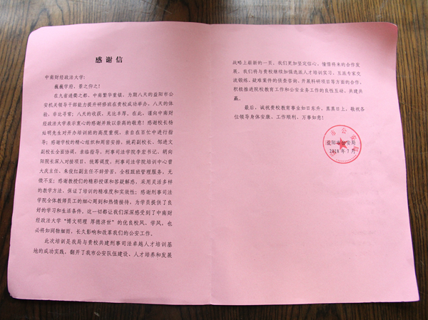 (通讯员杨雨晴)近期,我校刑事司法学院培训中心合作伙伴益阳市公安局向我校发来一封情真意挚的感谢信,专门致谢我校领导及我院领导对益阳市公安机关领导干部能力提升研修班工作的殷切关心与悉心指导。
