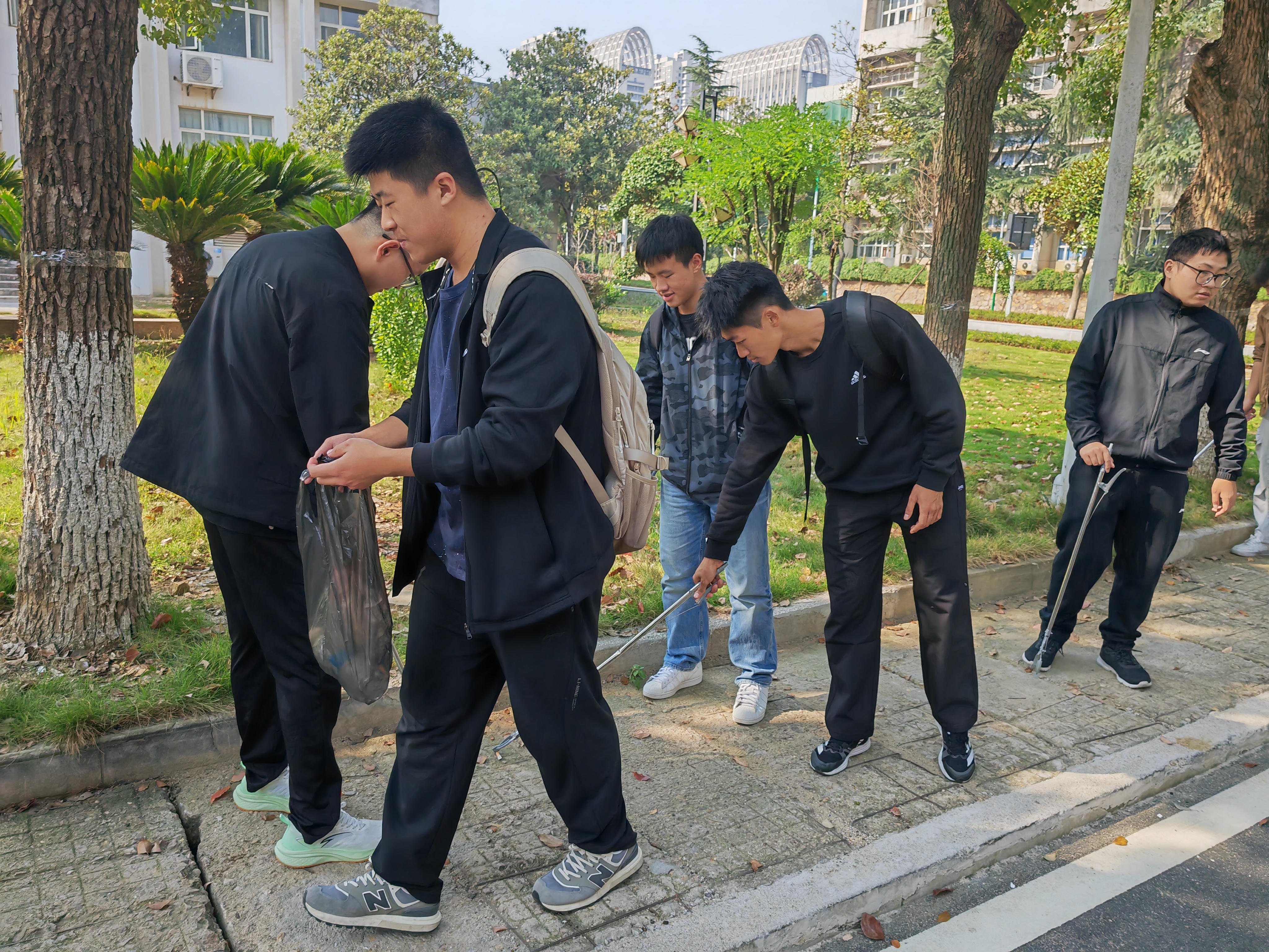 午后清风徐徐,志愿者们准时在文治楼前集合。大家手持清洁工具,分组有序前往中南大道及中区主干道沿线。同学们协作清扫、仔细捡拾,清理落叶与杂物,连角落缝隙也不轻易放过。忙碌的身影与秋日校园相映成趣,构成一幅生动的劳动画卷 。