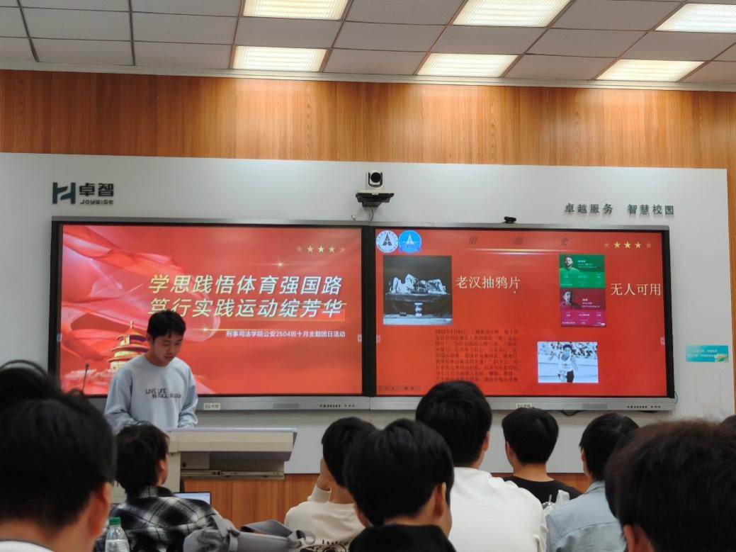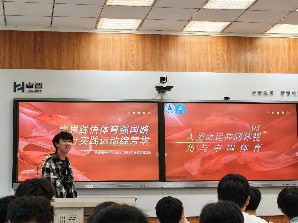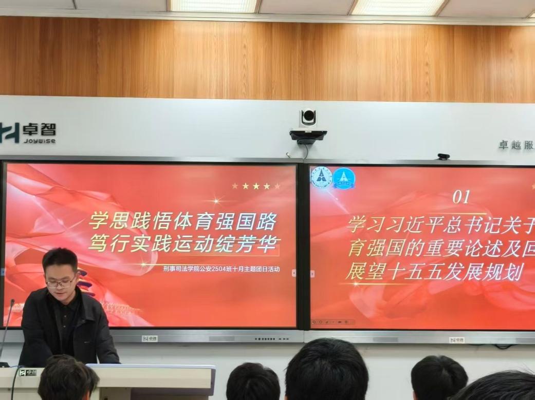 新闻网讯(学生通讯员 安宁 何字颖 李明阳 柯维蓁)10月29日,公安2504班团支部以“学思践悟强国路,笃行运动绽芳华”为主题,开展十月主题团日活动。