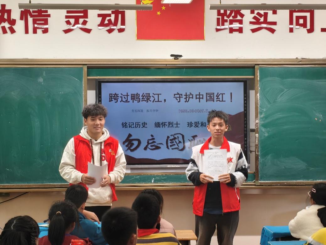 新闻网讯(学生通讯员陈诗睿)10月23日,刑事司法学院志愿者协会星火志愿服务队前往武汉市光谷第五小学,开展“跨过鸭绿江,守护中国红”爱国主义主题教育宣讲活动。活动聚焦抗美援朝战争的光辉历史与伟大精神,通过详实讲述、互动问答、英雄故事等多种形式,引导青少年铭记历史、缅怀先烈、珍爱和平,从中汲取砥砺前行的精神力量。