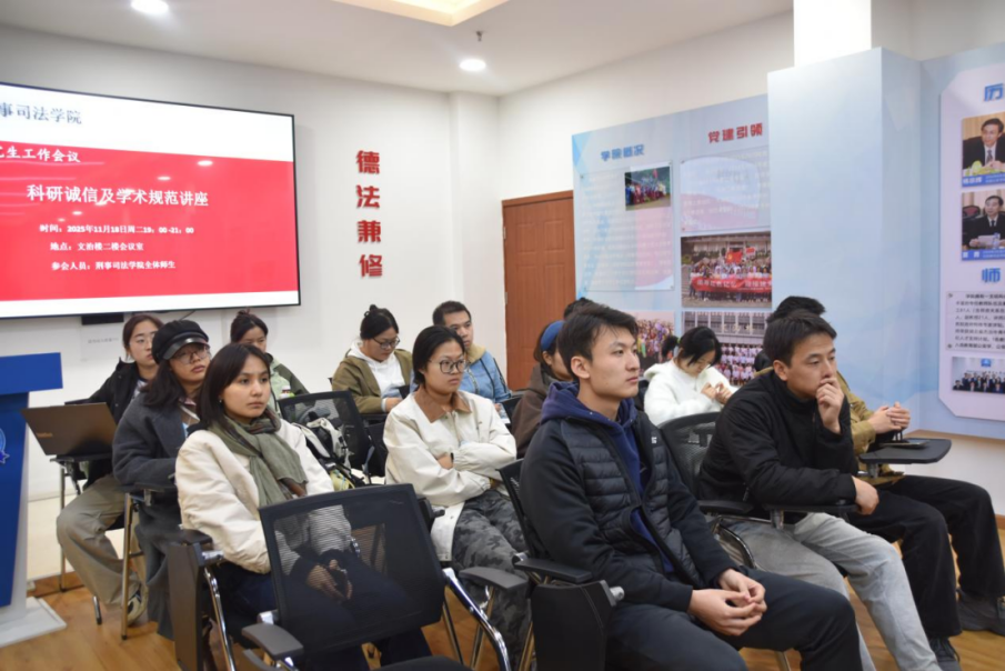 新闻网讯(学生通讯员 廉传誉 摄影 李梦洁)2025年11月18日,刑事司法学院于文治楼二楼会议室召开研究生学风建设与科研诚信规范讲座。学院副院长焦俊峰教授主讲,学院全体研究生参加。本次讲座聚焦学风建设、论文写作与科研诚信,旨在进一步强化研究生学术规范意识与科研诚信素养,提升我院研究生培养质量。