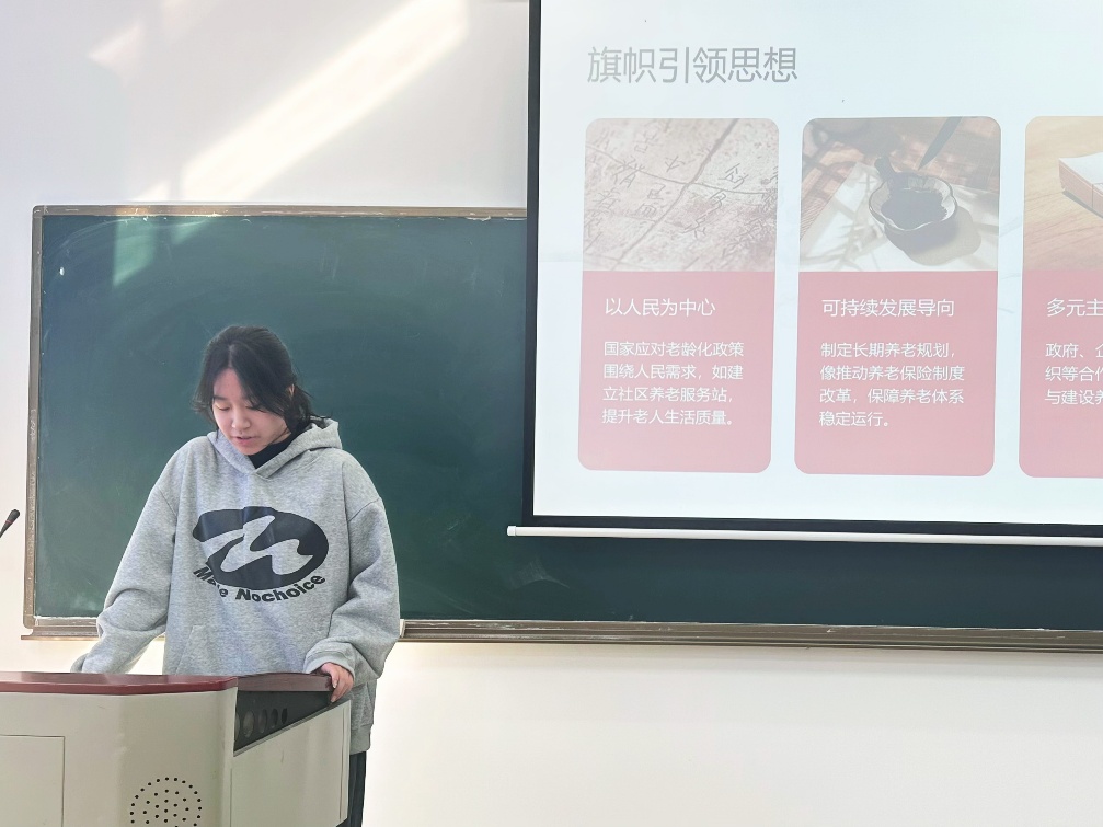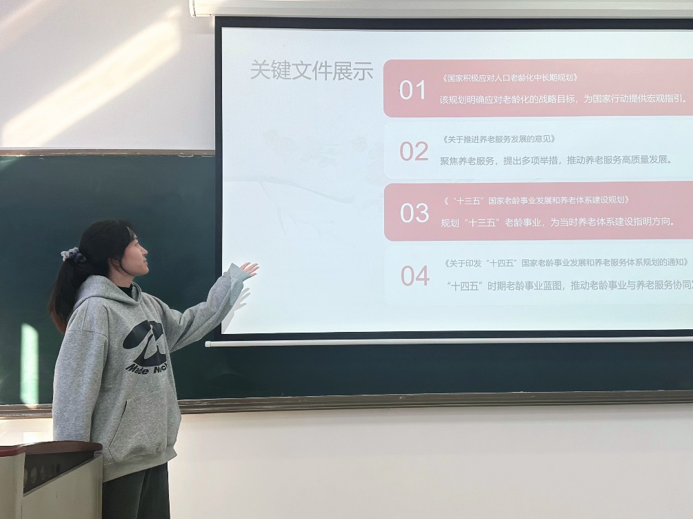 活动伊始,团支书从“以人民为中心”的核心理念出发,详细解读了社会应对老龄化相关举措的核心思想,阐述了可持续发展、多元主体协同与科技创新驱动在构建养老服务体系中的关键作用。通过对“积极老龄化”与“健康老龄化”等理念的剖析,同学们认识到,老年人是社会的重要资源和财富,推动老年人“共享发展成果”是社会文明进步的体现。