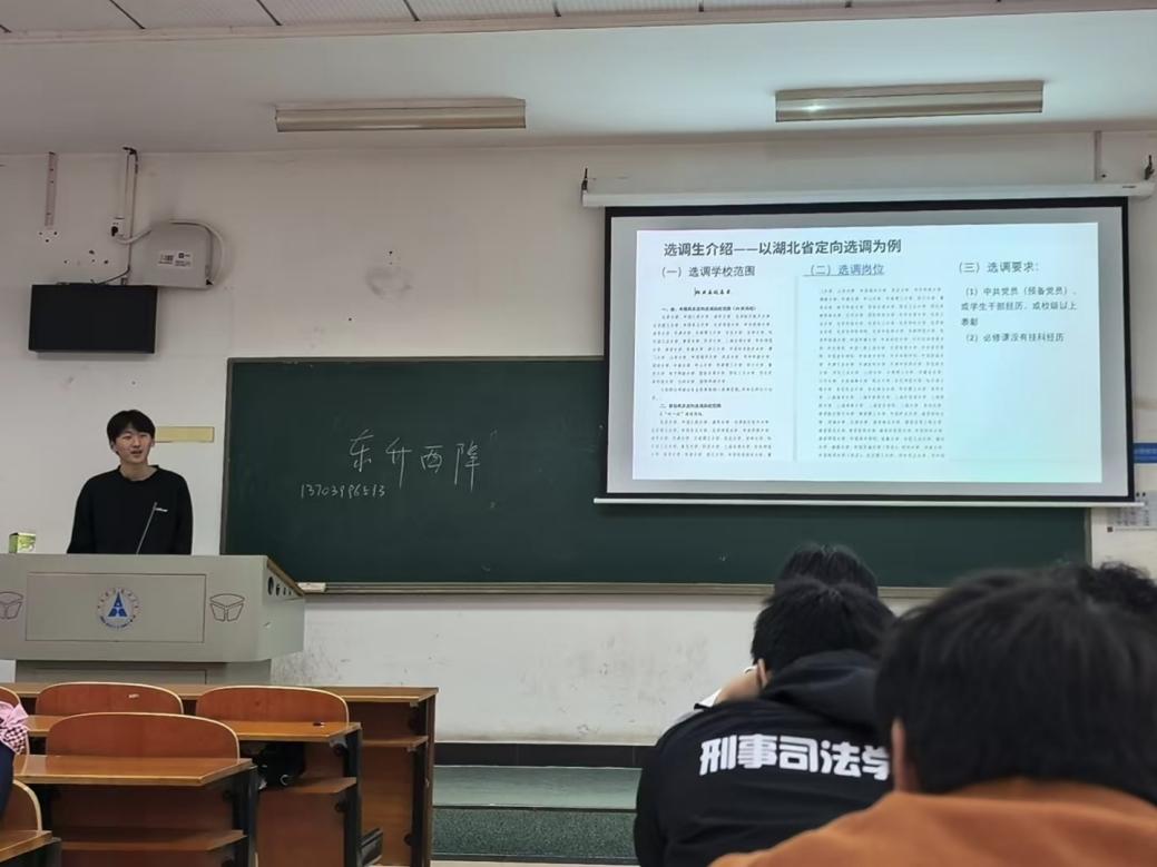 随后,班会特别邀请刑事司法学院优秀学长常克强,带来以“治安专业学习方向与实践”为主题的经验分享。他围绕专业课程体系、核心思维培养等关键内容展开,用通俗易懂的语言拆解专业学习的重点与难点,为同学们梳理了清晰的学习思路,赢得了现场同学的热烈掌声与诚挚感谢。分享中提到的三类核心思维模式,为大家提供了多元学习视角:金融学思维侧重创造性探索,公安相关专业思维注重规范应用,法学思维强调流程化逻辑。