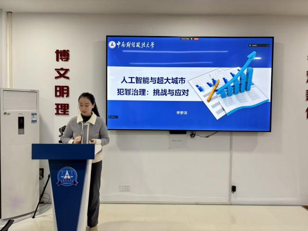 第二位发言人硕士研究生李梦洁围绕“人工智能与超大城市犯罪治理:挑战与应对”展开研讨,指出超大城市因其人口密集、系统复杂,已成为人工智能赋能犯罪治理的“最佳试验场”与“最紧迫需求地”并系统梳理了人工智能在警情预测、精准防控等方面的实践成效,同时从技术、法律与实施三个层面深入剖析当前面临的挑战,包括数据复杂性、算法偏见、隐私权保护、责任界定模糊、跨部门协作困难等问题,进而提出应构建“社会—技术—法律”三位一体的系统性应对框架,推动多元共治、强化技术适配、加快专项立法与伦理审查,在科技赋能与人权保障之间寻求动态平衡,以实现更高水平的智慧治理与平安城市建设。