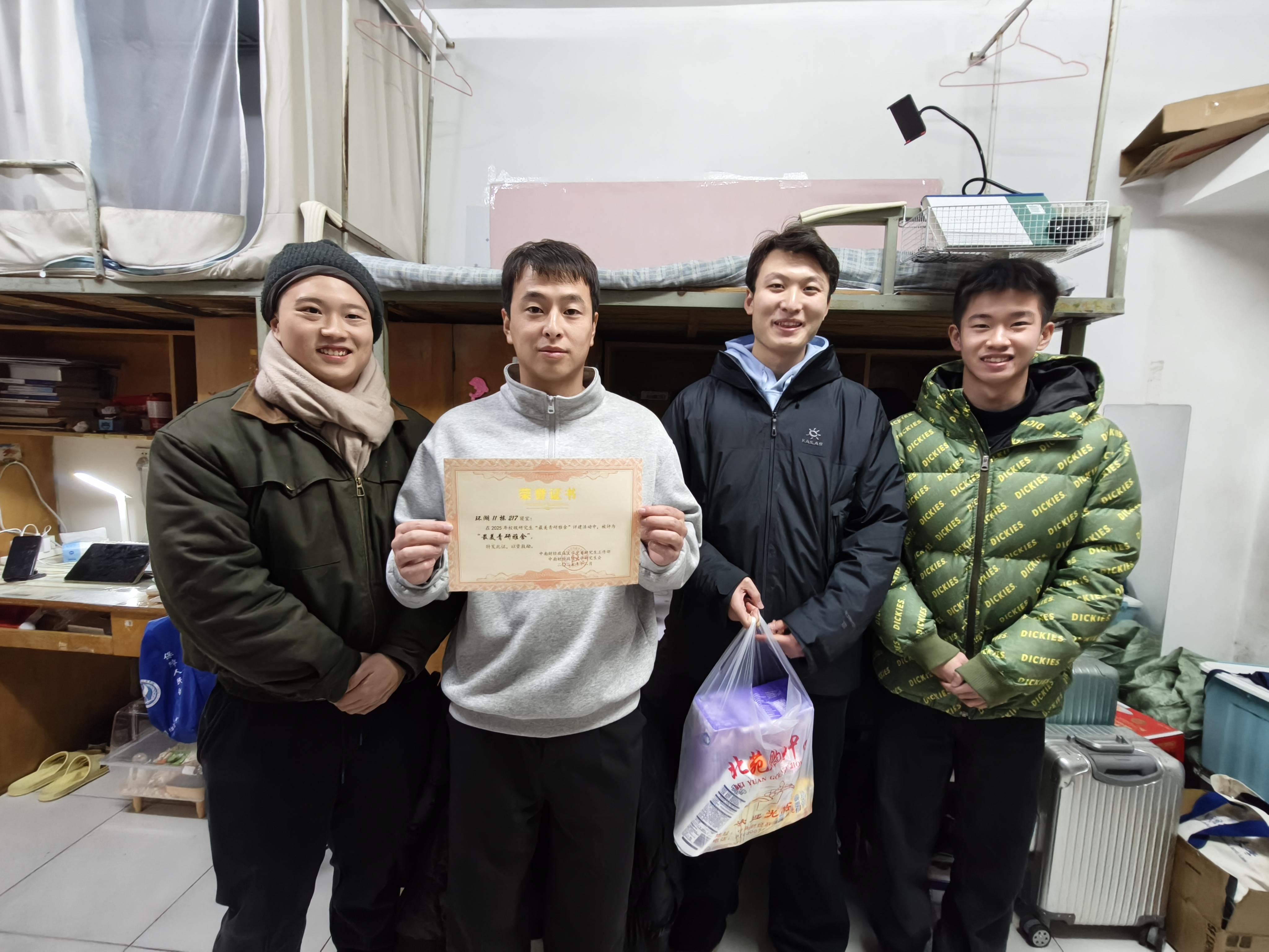 在“最美青研雅舍”获奖宿舍走访中,王晓丹和研会成员为获奖同学颁发荣誉、送上祝福。王晓丹在表彰现场谈到,获奖宿舍凭借整洁的环境、良好的氛围和文明的风尚脱颖而出,生动展现了学院研究生积极向上的精神风貌。她勉励获奖宿舍要珍惜荣誉、再接再厉,充分发挥示范引领作用,带动身边更多同学重视宿舍环境建设。同时,学院将持续关注同学们在宿舍生活中的各类合理需求,不断优化服务保障,努力为同学们打造更优质的住宿条件和成长环境。