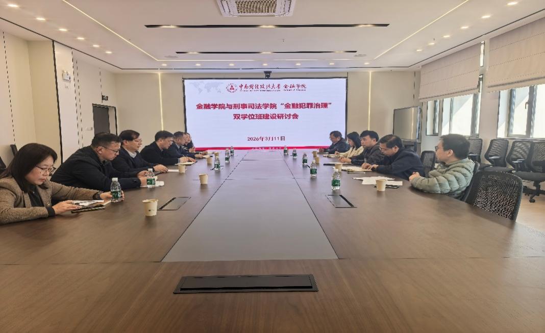 新闻网讯(通讯作者 袁莉)2026年3月11日下午,刑事司法学院院长董邦俊、党委书记张志刚、副院长焦俊峰、周凌,党委副书记司志莲等一行赴金融学院,就金融犯罪治理双学位建设开展专题研讨会。会议由金融学院党委书记汪平主持,金融学院副院长李建华、党委副书记刘琪、金融学系主任陈思翀等参加会议。会议围绕两院共建金融犯罪治理双学位班、推进学科交叉融合以及复合型人才培养等议题展开深入交流。