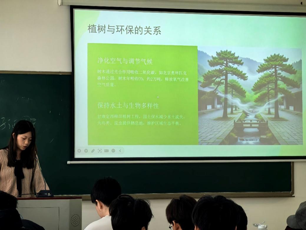 随后,同学们围绕“植树与环保的内在联系”展开热烈讨论,结合北京奥林匹克森林公园、甘肃定西梯田植树工程等典型案例,深入领会树木在净化空气、保持水土、维护生物多样性等方面的重要生态作用。大家纷纷表示,生态环境保护并非仅止于植树节,更应融入日常生活的点滴之中,从做好垃圾分类、坚持绿色出行到节约水电资源,以实际行动争做生态文明的建设者、传播者与守护者。